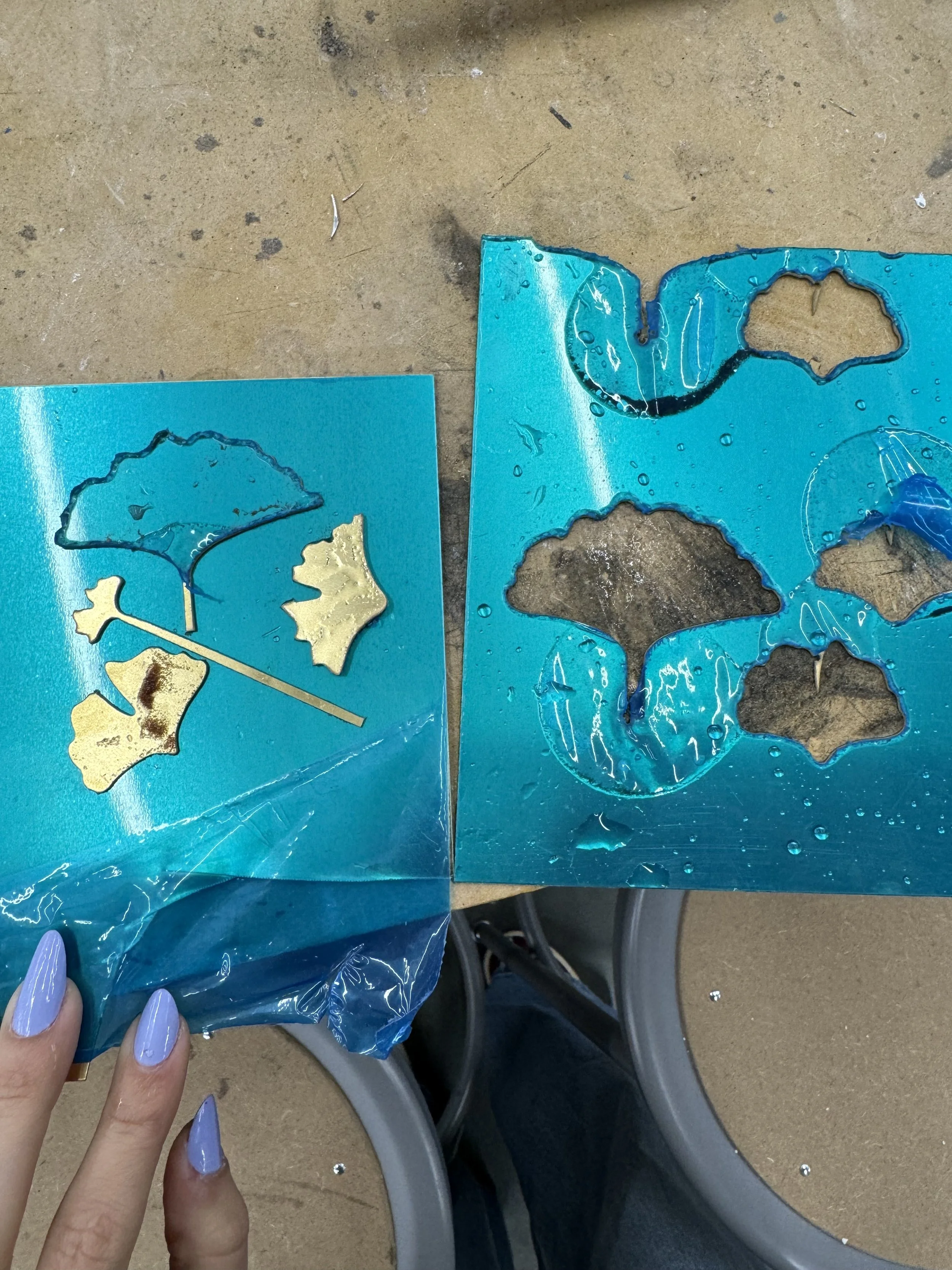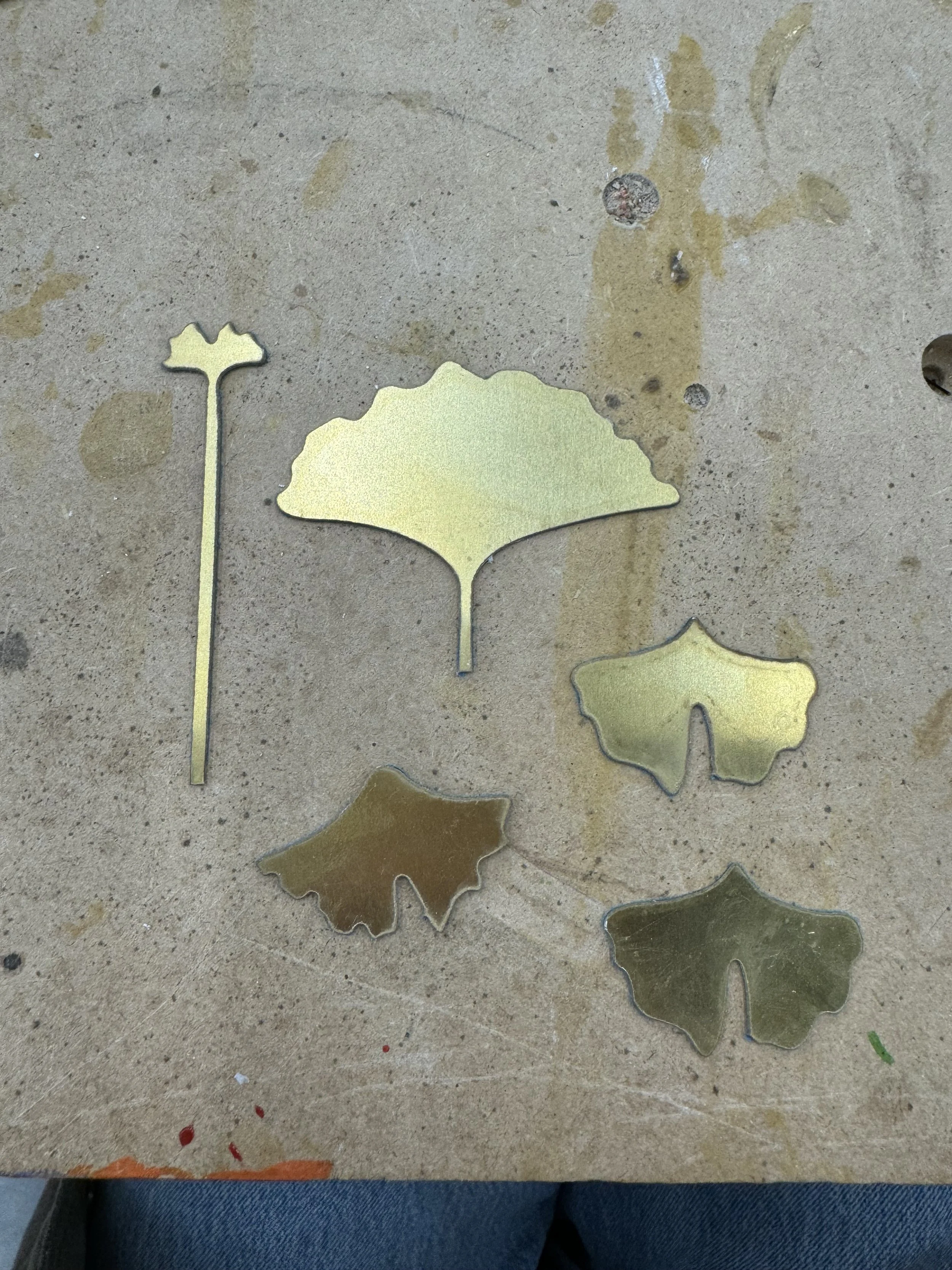 Using real pressed ginkgo leaves as reference, I designed the leaves in Illustrator and water jetted them